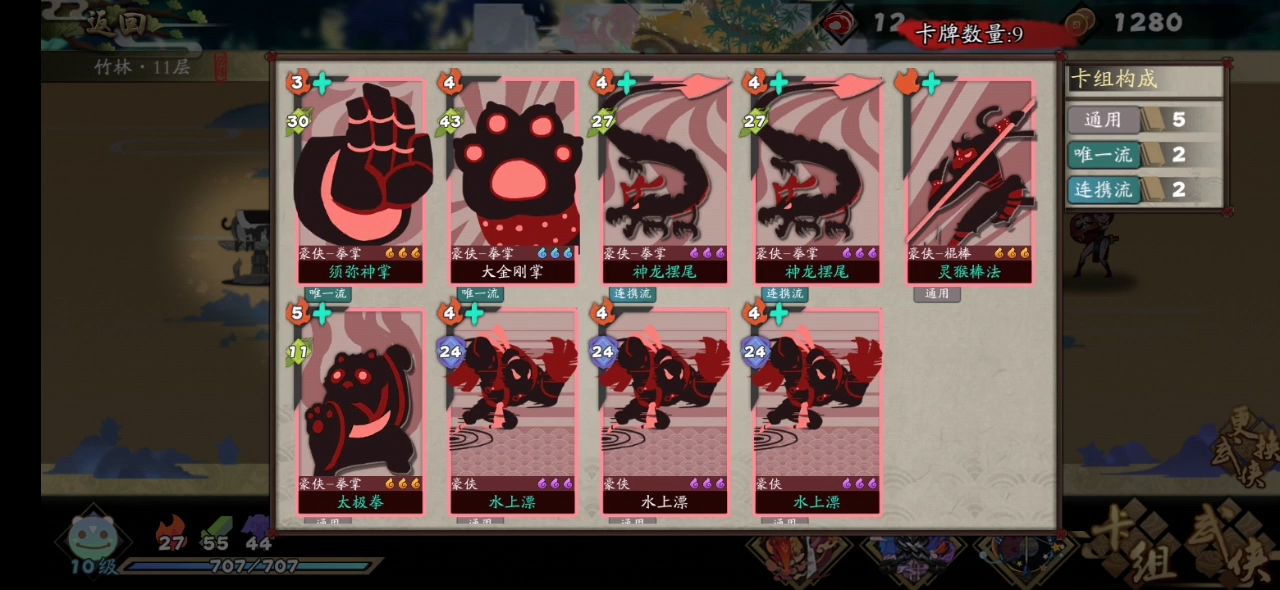 卡组构成如上,大手印和水上漂各两张,灵猴棒法一张,飘雪穿云掌一张,须弥神掌一张,扫滚是没删干净的杂牌。需要红化三僧,橙化铁掌,有普渡套最好,上来先开铁掌技能,用大手印加一大波怒,用猴棍加一下防御再用水上漂,之后再用飘雪穿云掌抽卡触发一下洗牌,这样一来又可以出一轮水上漂的连携,最后须弥神掌收尾秒杀。