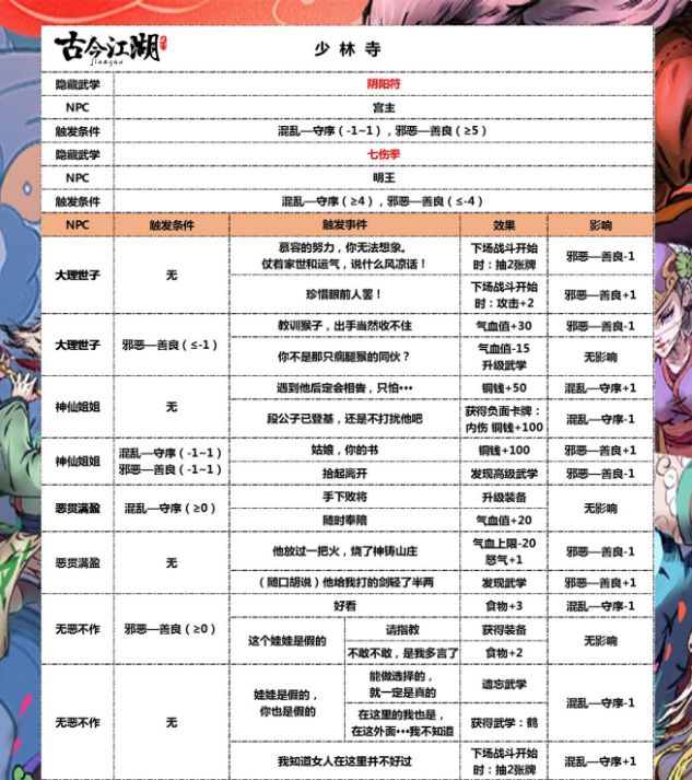 1.七伤拳 2.灭绝-绝剑ps:前面是混守,后面是善恶坞主(慕容复),明王(鸠摩智),大虫合蟆(3 -3)铁尸,铜尸,金轮(3 -3)铁铜鹰(3 -2)铁铜聪辨(3 -2)3.阴阳符 4.空明拳这两个可以选的阵容很多。ps:前面是混守,后面是善恶豪侠:飞天蝙蝠(-1 1)宫主 丐帮帮主(0 1)太极传人 南苑大王 三僧(1 1)游侠:弯弓神箭(1 1)长春首徒,神雕,九剑