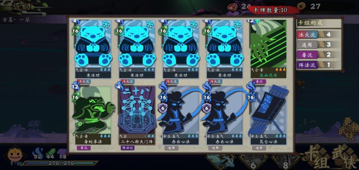 《古今江湖 气宗毒流 嵇中散人》气宗 法术机关枪真的挺好用的。【方法】◆你要有一个嵇中散人。主要用他的技能叠毒,初始就有22的毒。牌只用一张叠毒。◆灵蛇拳法,复制10个,你有,就复制。不要,带其他的毒牌。一张毒牌都不要带。其他牌 能删就删。有几张加气的牌。比如。太极张三丰的 气宗命根子。【效果】秒过地狱。敌人一个回合就死。其他效果还没试【阵容】气宗 毒流 三剑客。魔教中人、玉树公子。嵇中散人。