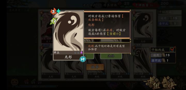 1、什么是洗牌呢,回返以为是打完就回来呢,刚用了次一脸懵,因为没见到牌回来,看了下解释才知道理解错了2、雨林好多选择混乱守序、邪恶善良的NPC,选择除了NPC的奖励,对副本奖励有影响吗?难道有隐藏秘笈?3、如果给幽冥神掌加了乱舞,攻击有灼烧和冰冻的boss,另一个boss没有,另一个boss会受到伤害吗?不知道情况没敢加,怕后面难打,所以没法试验。4、阳炎劲只加灼烧,因为有见龙所有加了冰冻,