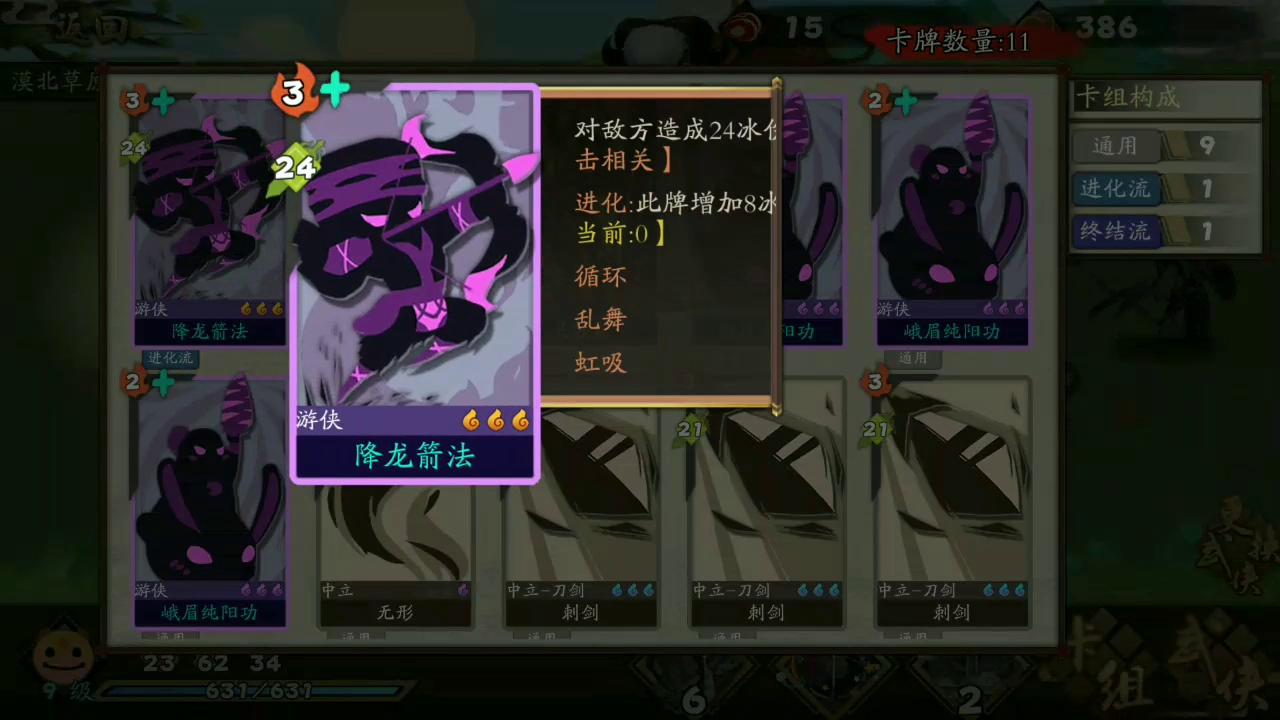 看到大佬发了一个木剑单卡通大漠的视频,心血来潮我也想试试单卡通。选了刺客的后花园——古墓主要输出就靠赤练化形被动多2层,三生套生三张临时牌,忠武套临时牌打两次,疯狂输出。可惜星弧没找到翻倍,否则绝对爽上天
