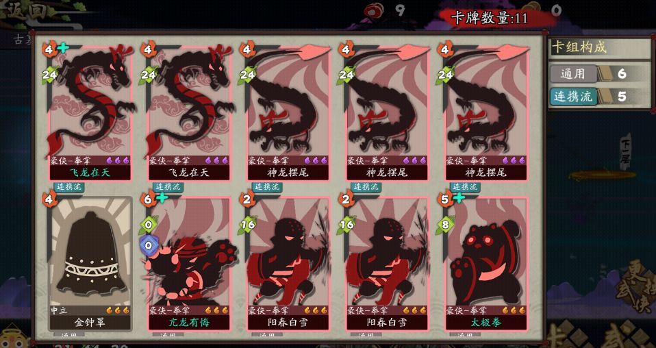 【总结】1.【远山居士】目前和一拳流相性最高。2.开局【南苑大王】后换【远山居士】3.【红化形】建议不用做4.除了【抽牌卡】建议只要拿【暗醉拳】5.历练还是依旧优先【叠甲流】【】新武侠展示https://www.taptap.com/topic/10378260【武侠搭配】【平民开局】太极传人+南苑大王+宫主因为【太极拳】只能打拳掌牌。所以开局必须【南苑大王】提供冲拳【开局