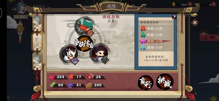 刚入坑15天的萌新 化形屁都没有一个 没英雄职业历练又好难 不打历练化形又做不出来 无限闭环了(只能氪金救命了) 氪金划重点 有提成。口胡开始正题 第二周历练终于可以打噩梦了作为一个基本没氪的咸鱼只有冰火气宗跟扔针刺客过了困难 好难受刺客阵容简直是耻辱 (但是噩梦过了)这种垃圾初始让我硬生生的换牌换到过关第二次尝试开始正题刺客过完以后开始尝试气宗多次暴毙思来想去这次气宗历练是古墓图啊古墓限定