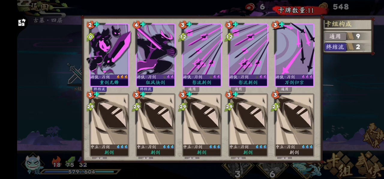 纪念第一次用杨过抽剑流过炼狱,大卡组也有大智慧本来想着随便打打当探路,等大漠用万剑追步过的,运气好拿的牌还算顺利就直接通了。打的磕磕绊绊的,很废心思。