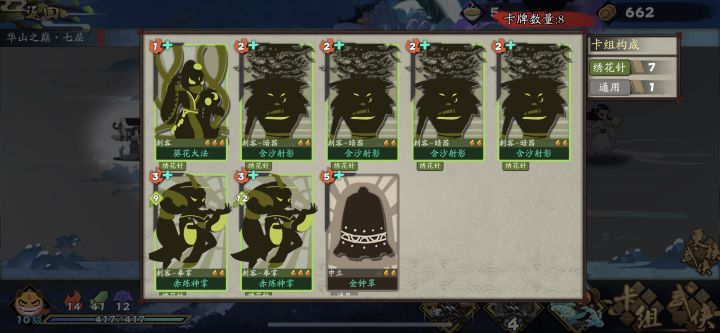 首先说明不需要四张含沙射影,两张易可装备方面就是 忠武一层优先找 装备-含沙射影中途过渡卡牌可以用 暴雨梨花神兵方面带 扇子 弓 剑