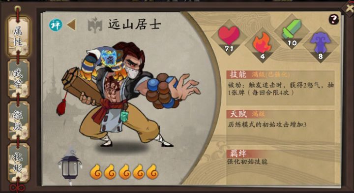 其实第三层就成型了,但怪太弱血太少体现不出来。4层勉强能当沙包说正题阵容:哈蟆必须,其他,南苑大王=宫主>剪刀>明王,任选两人与哈蟆搭配。装备:无需求,随便,加手牌上限的可以拿牌库:牌库数量必须少于手牌上限+1!这很重要!意思是,开局手牌只摸五张的时候,牌库就只能六张,超过了,就不能无限自残。手牌:丐帮心法,锁喉,灭剑,三张必须有随意2张。这很重要,满足牌库数量的条件,这三牌能无限自残。