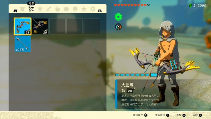 操作步骤:1.如图1至少准备2把弓箭,弓箭A和弓箭B2.打开背包LR选定弓箭栏按Y排序,想要复制的弓箭A要在弓箭B前面且在同一行3.装备弓箭A4.选定弓箭A5.退出背包6.按M2开始7.复制盾牌和武器同理