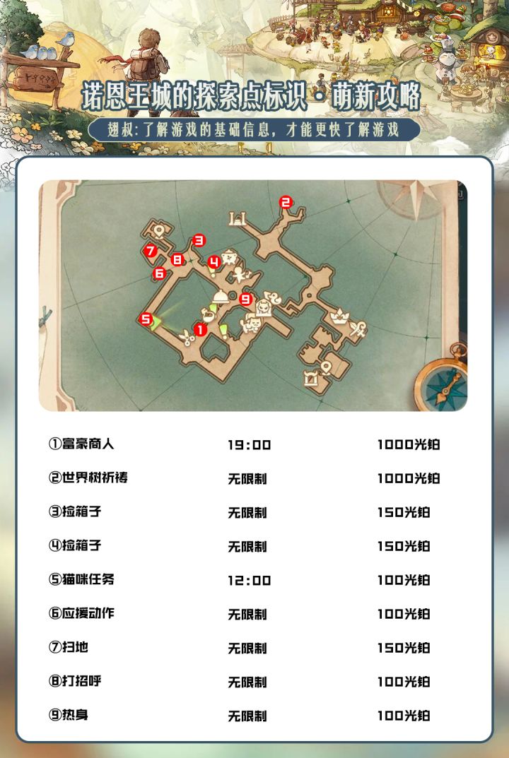 很多小伙伴都会问翅叔关于王城的 1000光铂如何获取 在哪里获取 今天把详细的获取方式给大家标记出来希望对大家有所帮助哈① 富豪商人 19:00出现 可接任务 完成任务 可获得1000光铂②世界树祈祷对着瓦缸做祈祷动作 可获取1000光铂③捡箱子④捡箱子⑤猫咪任务出现时间 12:00⑥猫咪任务对着小男孩做应援动作 (应援动作需要加入骑士团并且获得过岛屿权才可解锁)⑦扫地⑧