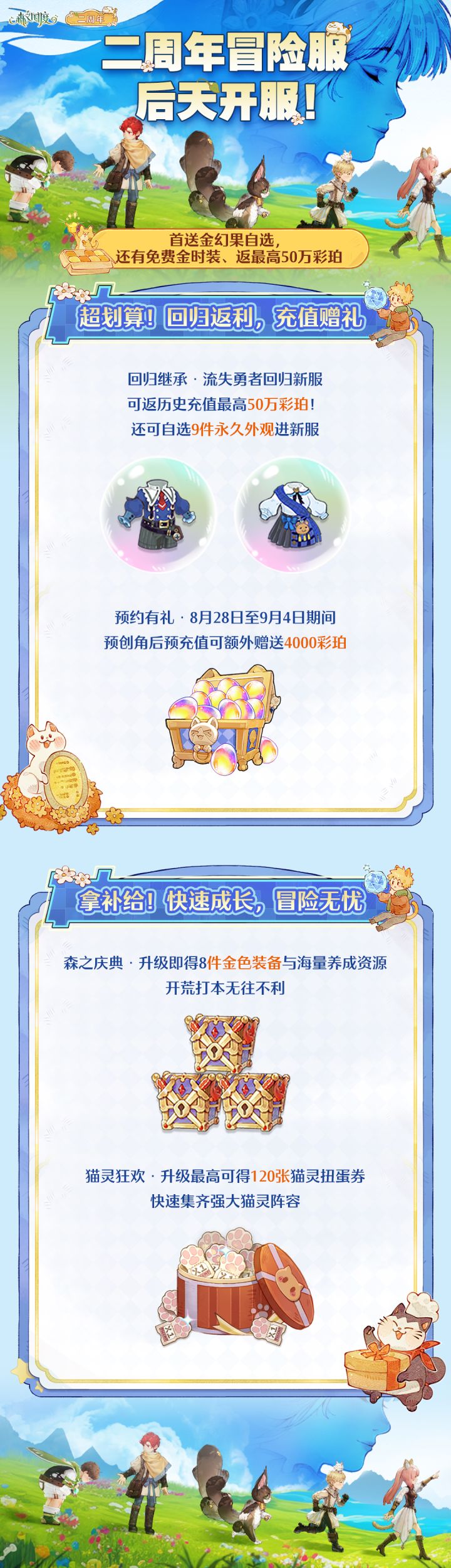 拿补给!快速成长,冒险无忧森之庆典·升级即得8件金色装备与海量养成资源,开荒打本无往不利猫灵狂欢·升级最高可得120张猫灵扭蛋券,快速集齐强大猫灵阵容#森之国度 #森之国度创作征集令
