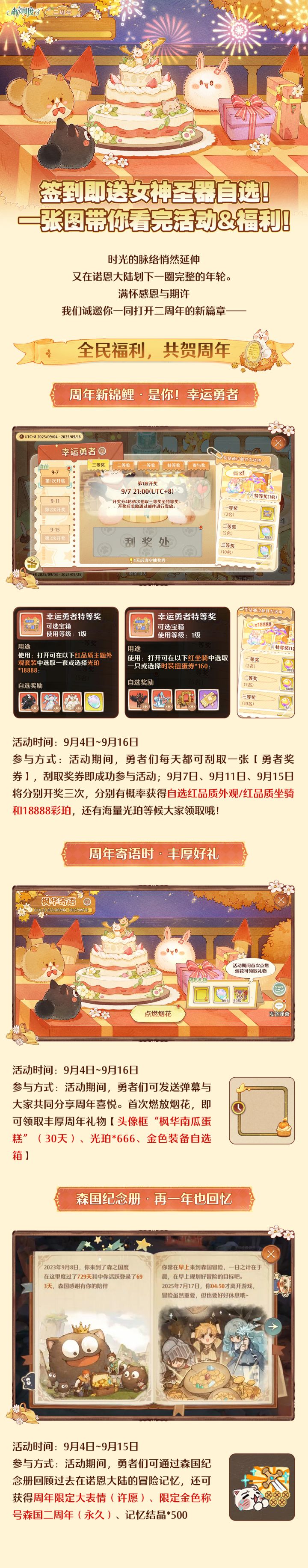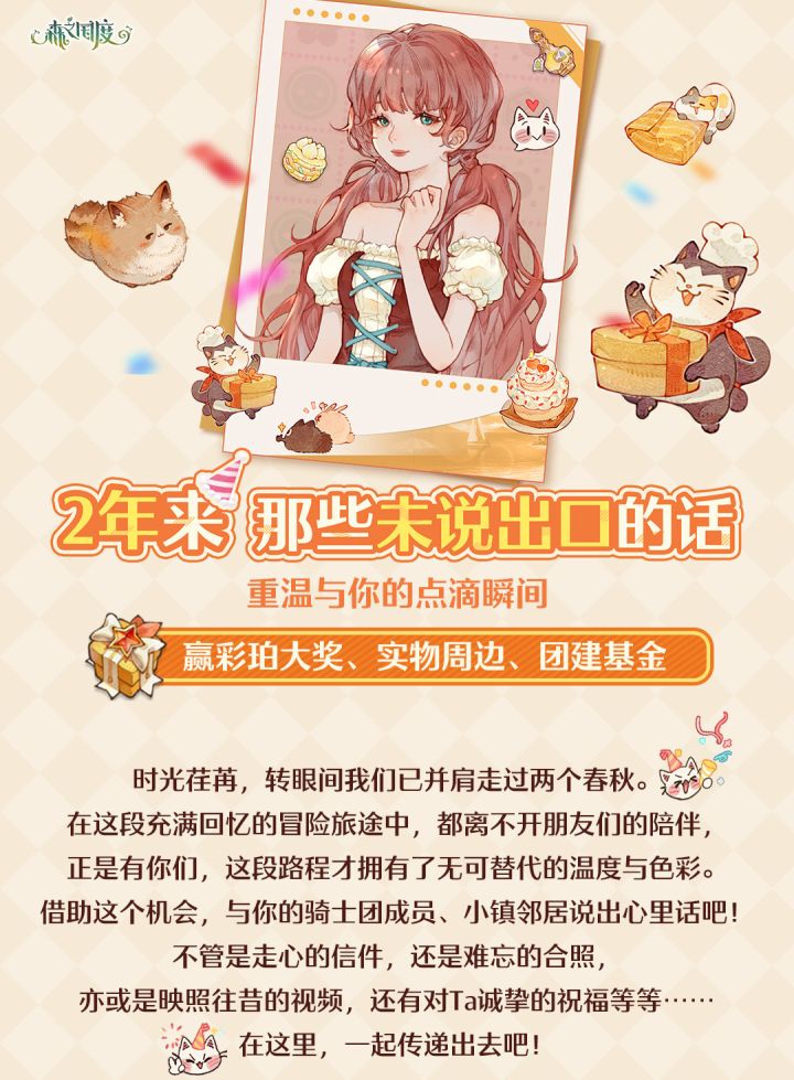 时光荏苒,转眼间我们已并肩走过两个春秋。在这段充满回忆的冒险旅途中,都离不开朋友们的陪伴,正是有你们,这段路程才拥有了无可替代的温度与色彩。借助这个机会,与你的骑士团成员、小镇邻居说出心里话吧!不管是走心的信件,还是难忘的合照,亦或是映照往昔的视频,还有对Ta诚挚的祝福等等……在这里,一起传递出去吧!==联系我们==官方网站:官方QQ群①:781941910官方QQ群④:87322