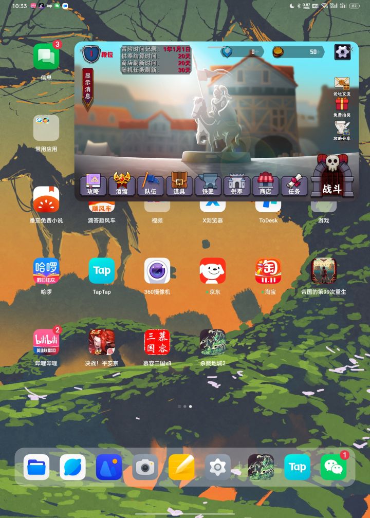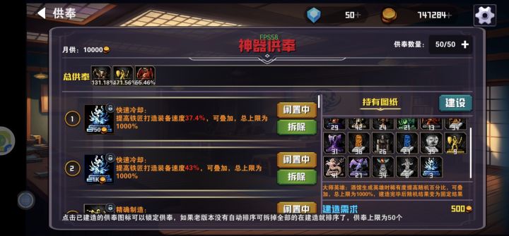连续肝了3周了,有几个建议希望作者可以优化一下。第一个:供奉50个还是不太够,黄金雕像加大师英雄这两个基本后期都会带的供奉随便一整就占用了快40个位置,如果重头刷这些说真的体验感极差。第二就是能否在供奉ui这里增加一个一键全部激活,在点一下一键全部取消,偷税这个我估计也算是默认了,既然这样就更加方便一些。第二个:3倍速说真的不太够,建议能拉到5倍,现在高体质龙裔刷一趟19层供奉图纸需要42秒,还是