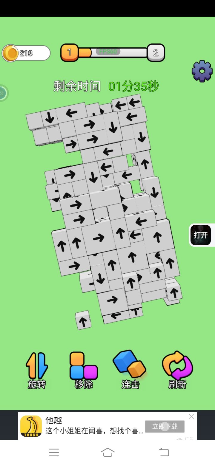 玩了一会,发现这个游戏他还有点小设计。第一个是,当有两个相邻的方块箭头是相对的:→←,那么你可以通过点击这两个中任意一个来同化另一个箭头,这个过程是不可逆的,除非是三个箭头:→→←,这种情况下,通过点击左右两边的箭头来同化中间这个箭头,以至于其方向可以来回改变。第二个是,一个前方空旷但还不能出去的箭头,点击这个箭头时它会向它的方向移动,我们就可以在它走开的这段时间移走被它挡住的方块。另外他这