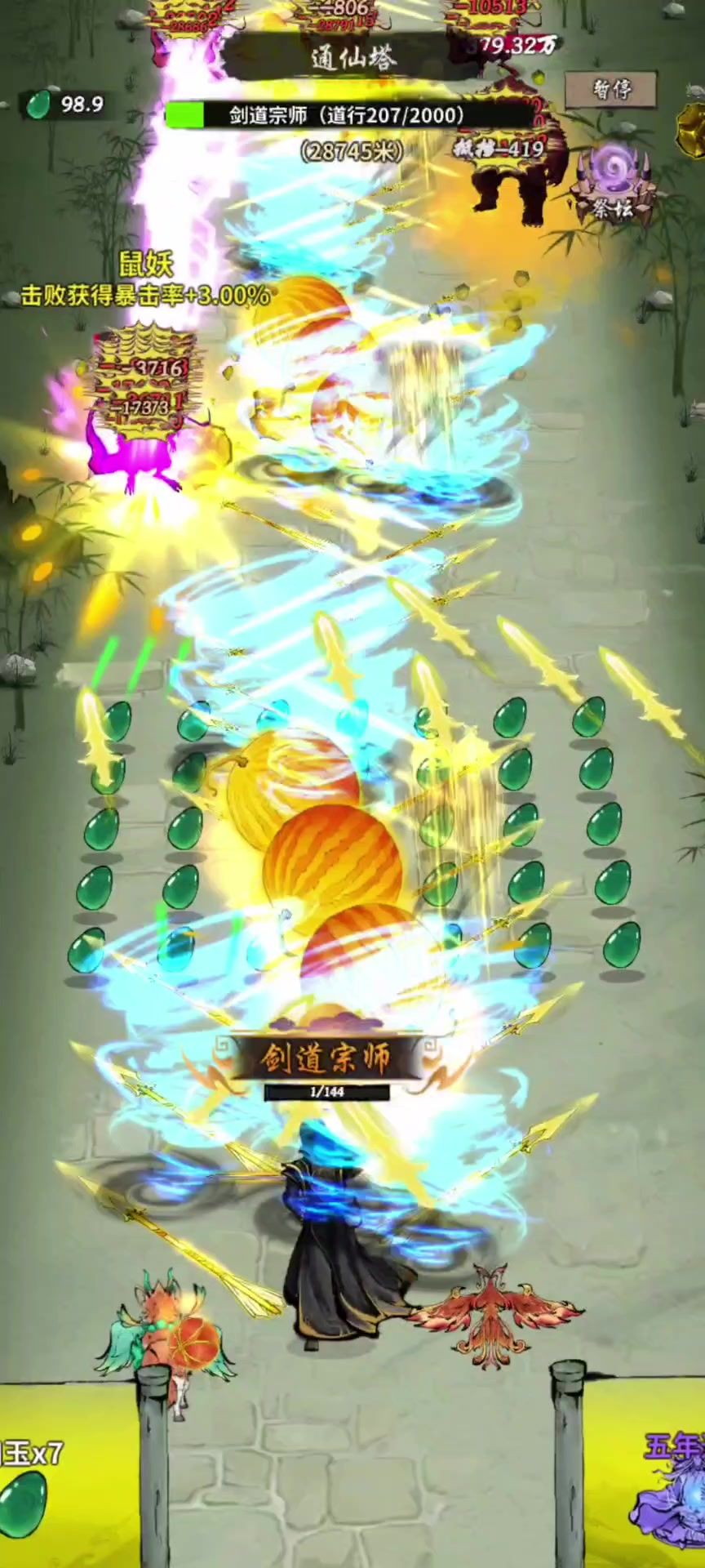武器带弓箭 职业道士或剑 (视频后面有装备搭配) 打法5技能,弓箭,风和瓜这3个必须带技能 其余两技能 可选择爪 轮 雷 火 铜钱 苟3W分舒服打法前期先捡暴击到90暴击 再考虑攻击,不要搞什么6级技能 4仙技能后 ,祭坛重点:找伤害书和减速牌这两核心 可刷一下5玉祭坛 ,只刷一次,9幽一次不要去刷 等后面幽玉富有了看情况刷 先暴击 爆伤 攻击 攻击百分比
