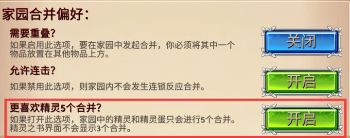 设置说明-家园合并偏好-更喜欢精灵5个合并