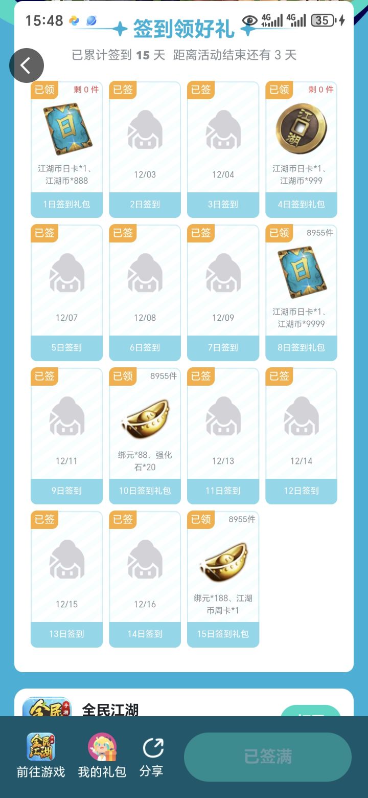 15天签到完,打开奖励就只有第一天的,这弄啥呢?还有两次是有兑换码结果还用不了,骗子😡#全民江湖