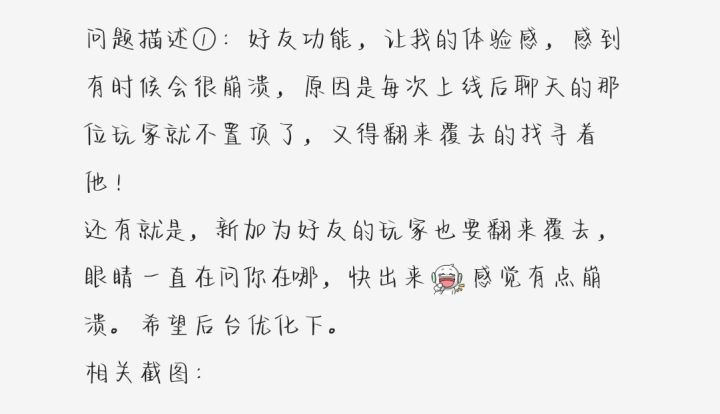老韩GM大大,想法如图谢谢!另外11月10号更新的新增远程购买的功能。我想说的是【少了逛街体验感以及为了捡漏和买东西逛街是看到满大街都是人的情景】希望官方考虑优化一下。毕竟有些东西手动才有意义。都聚集在大街上购物以及逛街也是种乐趣。另外提议:希望官方在重大功能升级或替换以及优化更好的的体验感时。发出一个投票帖。因为有些重大的改动可能会流失玩家。估计这个提议不会通过因为概率不高有些改动会变成民