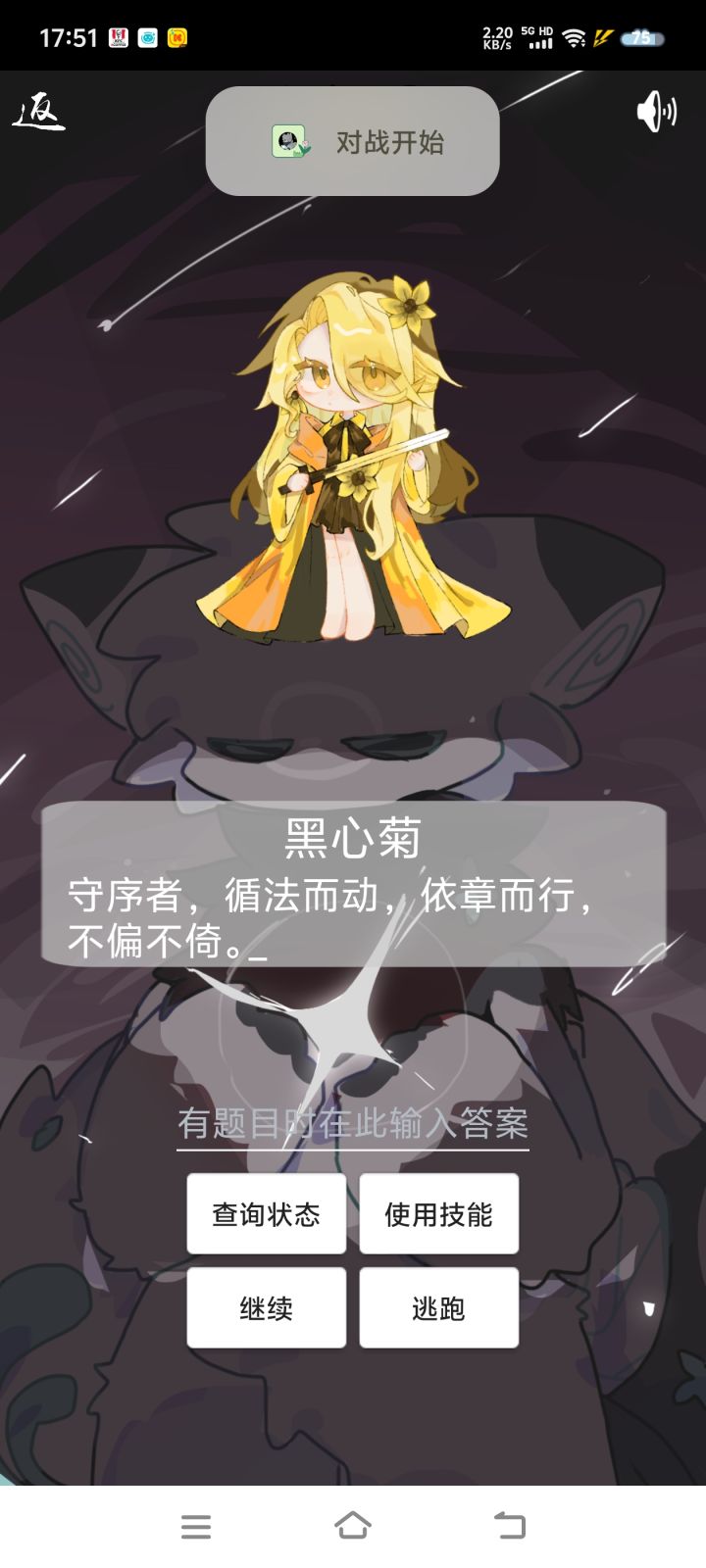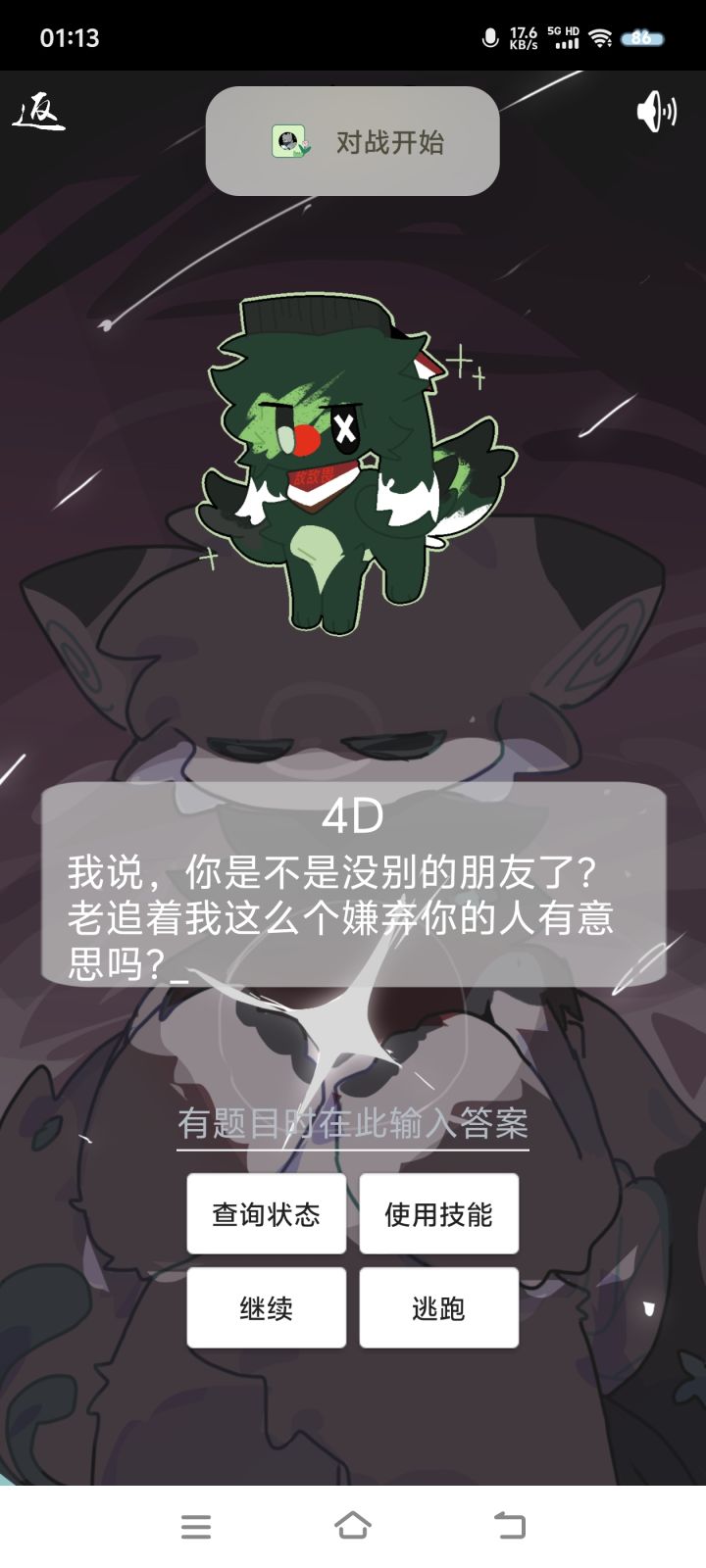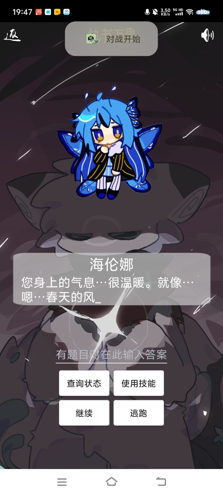 更新时间2025.12.14更新方式群内下载最新版覆盖式更新(不要卸载原软件文件)更新内容1.新增角色灵犀2.实装角色语音-艾莓3.修复对战巴库技能固定50点的bug4.修复主线章节bug,现在第六章是完整版了,也不会出现跳过剧情说没有精灵了5.新增圣诞节活动对战角色灵犀与羽毛6.新增指定挑战功能找黑蔷薇闲聊输入对战xx即可7.初步启用新题库代码(目前仅包含小学500题,顺