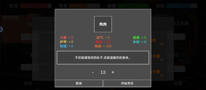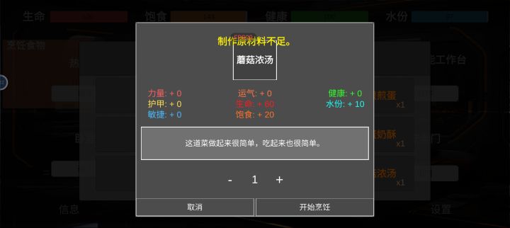 第一个水分显示有bug,一直消耗会变成100,导致我有一次没注意差点噶了,我看这里是100就没注意,结果后面一看都没了,血量一直掉,希望修复一下第二个这个数量加减能不能加一个手动输入呢?我想做几十个的时候需要一直点,等我换一下我就只需要一两个的时候又需要点回去,有点麻烦,这里有点点耗时间。当然,这只是我的小小建议,如果难度挺高就算啦,麻烦你咯
