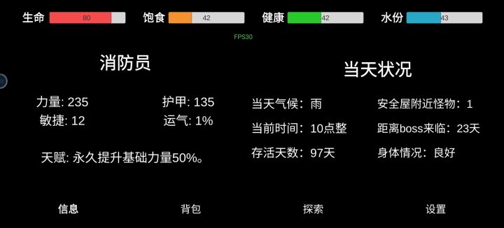 这游戏很好玩,每分每秒都会减所有状态是很真实的设定,但是这样游戏累,节奏感觉太快了,掉的很快,我打几个小时不敢休息,一直点一直点,一上午死了三次,两次是30级以后,就心态崩了,不能存档! 打怪看不见药品数量,打架界面也不能打开背包查看,就有时候看着有药,点两下就没了。。。。很尴尬。然后就被打死了,还没有存档! 还有就是没有游戏提示,这个我是真的无语=_=,我玩其他提前,会有boss即将到达的提