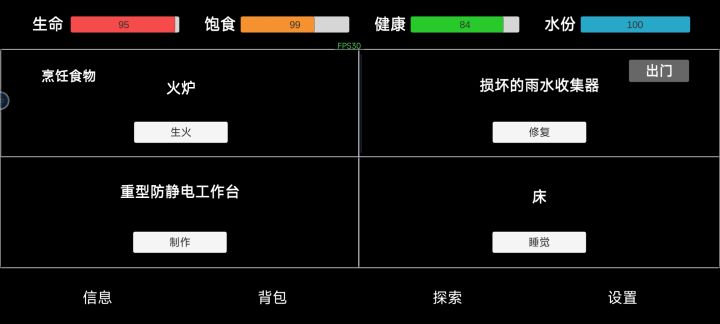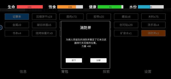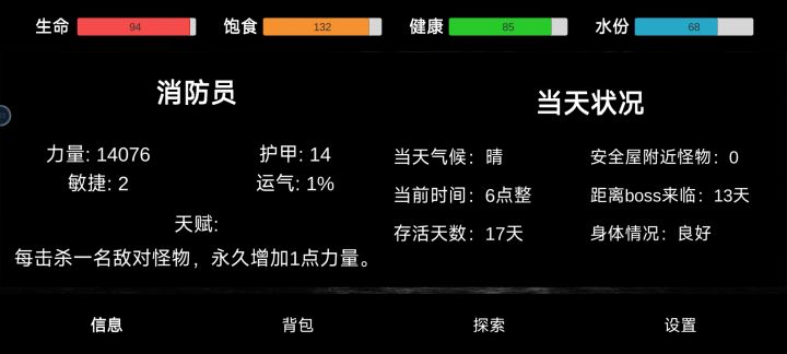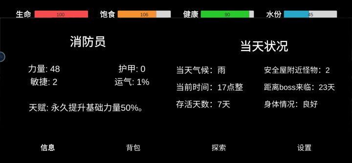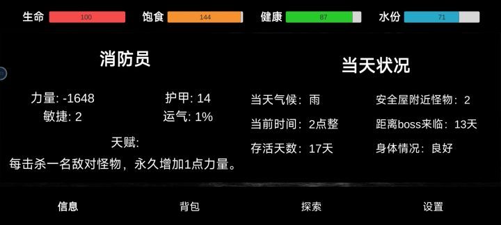 今天开的新档消防目前第3天卡死,血量只能抗2次攻击,只剩俩创可贴,饱食度水份都也在50以下了,位置在医院,第一天居民楼搜到5个饼干1瓶水血量40转到医院后就出不去了,药品搜多少吃多少