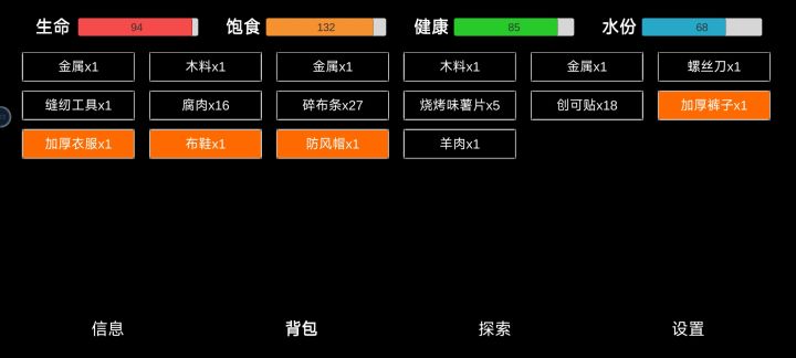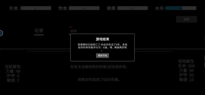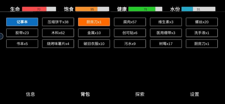 搜物资时遇怪逃跑机制问题很大,完全跑不了,跑了下次遇怪直接掉血,物资都搜不到就要死了,医院搜药品全是微生素,每次刷新都遇怪,居民楼刚搜一把武器全程遇怪过度困难,开新档运气不好搜物资的过程中就要死,搜药品被饿死,搜食物被打死,可以说全拼运气过度开局,还是说开局医院居民楼两头跑?