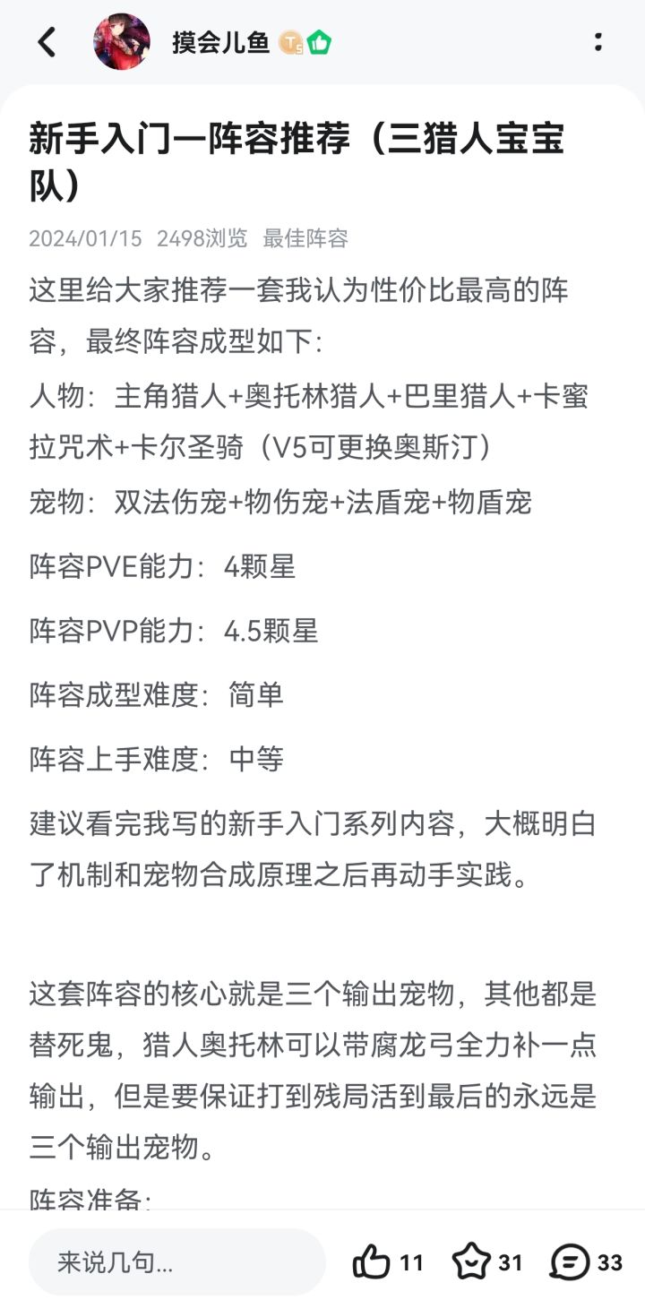 游戏ID:1199814675257241600游戏名:三猎教教主阵容:三猎人宝宝队这里给大家推荐一下我的三猎宝宝阵容,最终阵容成型如下:人物:主角猎人+奥托林猎人+巴里猎人+卡蜜拉咒术+卡尔圣骑(V5可更换奥斯汀)宠物:双法伤宠+物伤宠(魔化神龙)+法盾宠+物盾宠阵容PVE能力:4颗星阵容(深渊卡66)PVP能力:4.5颗星阵容(85级后变成3.5星)成型难度:简单阵容上手难度:中