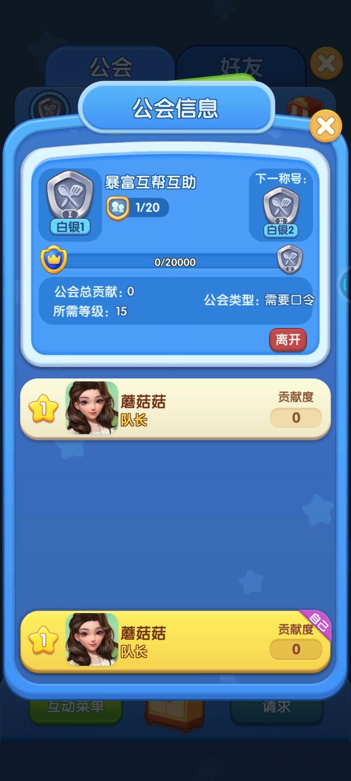 如图,新建了个工会,名字是暴富互帮互助(没错,朴实无华的小小心愿)。要求:15级以上,互帮互助口令:518518(没错,呼应主题,我要发我要发)大家一起来耍呀~