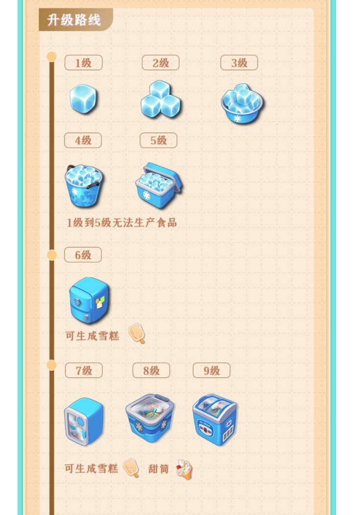 冰箱由冰块🧊合成,冰块可以通过活动获得紫色宝箱开出,建议把宝箱合成最高级直接开出2级冰块,也可以通过商店里面用钻石直接购买冰块碎片。1级冰块到5级都无法生产食品,6级可以生成雪糕,789级可以生成雪糕或甜筒。冰箱CD特别长,冰箱7级冷却时间要138分钟,8级要180分钟,9级要222分钟,等级越高冷却时间越长,建议2个7级的最好用,平时没事可以点出来合成各个等级冰激凌备用,以备不时之需,嫌占位