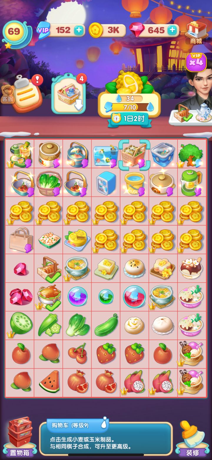 67级啦,我印象里应该是没有充值过的。玩的虽然慢,但是也算是小有收获。最喜欢的就是万能石。万能石:可对任意(非生产器)棋子使用,使棋子升高一级。点到万能石的时候,可以升级的棋子都是高亮显示,生产器是灰色的。注意不要随意拖动,防止误用。万能石可以直接得到,也可以由万能石碎片合成。4个1级碎片=2个2级碎片=一个万能石。 万能石我建议用在次最高级上:比如13级茶具,14级糕点拼盘上。次之就是1