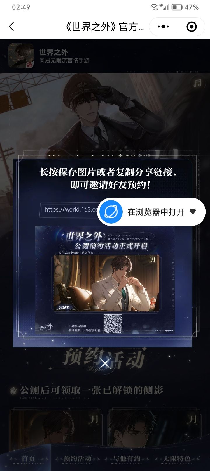 https://world.163.com/h5/20231220/yuyue/mXHUMLvYeVyvdHCz/?page_key=b2d4a5c6b7a511ee8fbb5254008089b9&traceid=439e0f&p_spanid=0.aWxXD&c_spanid=0.aWxXD#世界之外#攻略#世界之外预约抽卡互点