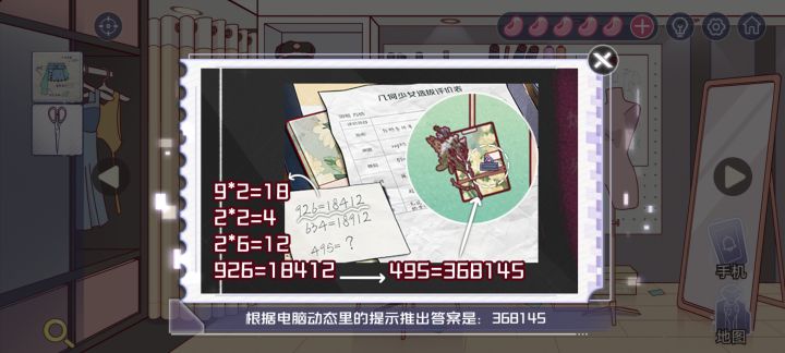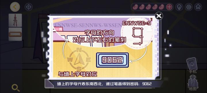 第二章:解药1.(练习室-场景1)点击获取【海绵垫】和【工卡】2.把【海绵垫】放在安婕下方,获得【纸条】3.(练习室-场景2)点击沙发上的密码锁,根据上面的提示(绿蓝紫),结合【纸条】上的线索(绿色-五角星、蓝色-六角星、紫色-四角星)和两个场景里的四角星、五角星、六角星的数量(四角星-3、五角星-4、六角星-6),输入密码:463(logo上有一个五角星,镜子里的六角星不算)4.打开柜子