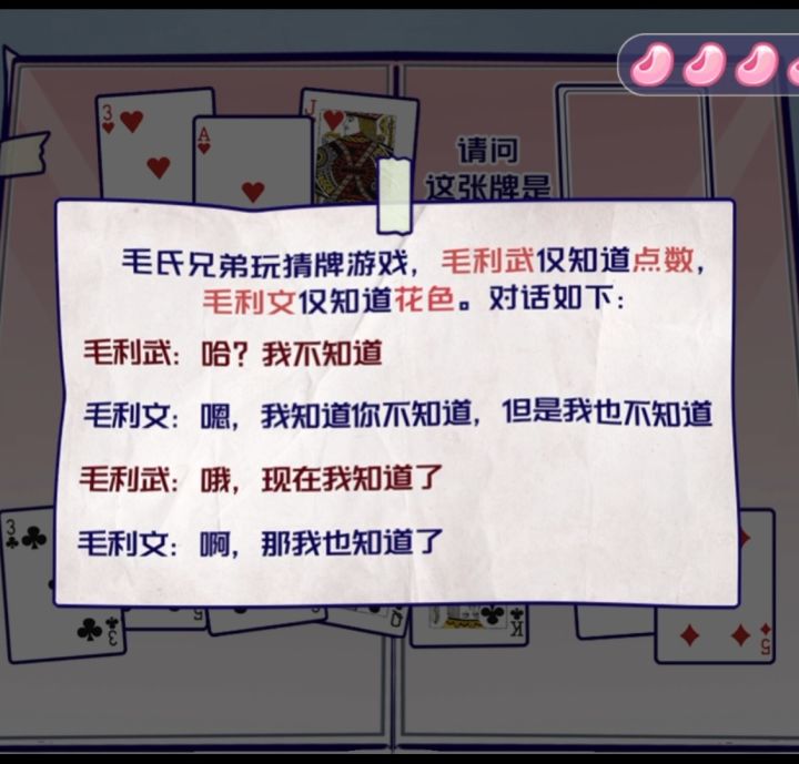(补充修改了部分描述)X知道点数,Y知道花色。有一个隐藏前提是,Y知道 X知道点数,而X知道 Y知道花色。在这个前提下,两人说话的信息是共享的,也就是他们也知道对方筛出的范围牌,再根据自己的信息缩小范围。第一句,X知道点数,却不知道这张牌,那么就排除了所有点数只对应单一花色的牌(27810♠6QK♣),剩下A♥♦ 3♥♠♣ 5♦♣ J♥♠第二句,Y说【我知道你不知道】,这说明【Y花色的所有