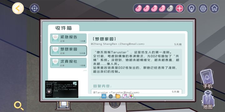 游戏卡碟那里我没截图,不过那个游戏《纸新郎》的游戏卡碟大家应该都看到了,除了那个之外,图1里的《传统文化通识》作者是莫黎和汤婆婆哈哈哈哈哈!图2点击右边像星空的长方形,就会出现“不要回答!不要回答!不要回答!”叶文洁默默按下发射…图3-9就是和《房间的秘密1》《房间的秘密2》联动了。看到小咪真的好想哭,它还在思念lan,用自己的方式守护lan。(图片数量限制,小咪的图放在评论区一张)因为玩过