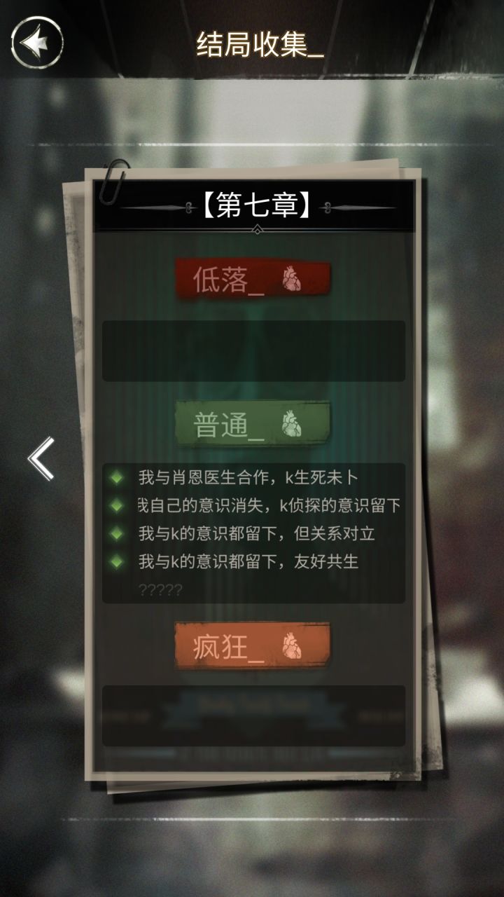 全结局+全成就get打了差不多快5小时了,终于把全结局和全成就拿到了,收集党一本满足😂唯一遗憾的是,5-7章似乎是没办法打出来疯狂结局和低落结局了(也许是我还没摸索出来?)如果后续打出来就再记录一遍吧( ・᷄ὢ・᷅)
