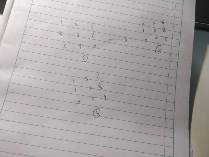 首先,我要告诉大家的是,这是一个有一个空格的九宫格拼图,如果还是不懂,你可能需要网上找到空一格的九宫格拼图技巧辅助,我也是学了下才把这个拼好的。开始正题,我们先把原图从左到右,从上到下标好序号。然后我说明下示意图,其实你知道1,2,3,6,9这五块图的位置就好,空代表空格,x代表除了我标出来的数字之外的其他序号拼图,这应该都看得懂。九宫格拼图就是把外部的拼图归位,先归位123,再归位47。所以