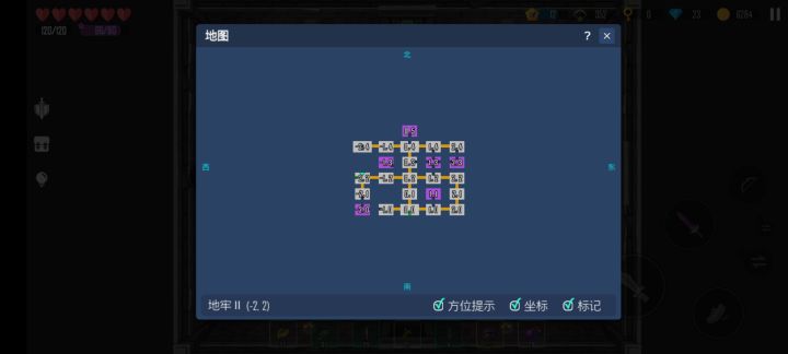 罗盘的指向的位置在图一,魔眼照一下在(0,12)湮灭了三次之后,有两个魔金块,他会说如图2最后,啊!!我终于打过了地牢2最后一关用了6个回音果个人推荐是用箭,其它武器追不上,跑得太快了