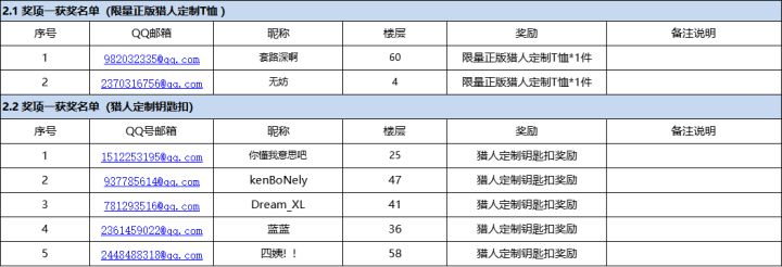 亲爱的猎人大大:对于9月29日-10月7日期间举办的【活动】吹起“彩虹屁”,麻酱好礼再次来袭,现获奖名单已火热出炉!在本次抢号活动中,共有7名幸运猎人获得我们的惊喜奖励,快来看看都有谁吧!活动(已结束)>>>恭喜以上获得奖励的各位猎人大大~我们已通过QQ邮箱(preward_zy@qq.com)联系您,向您索要实物收货地址,还请及时关注QQ邮件,于10月14日23:59前回复邮件提供相关信息