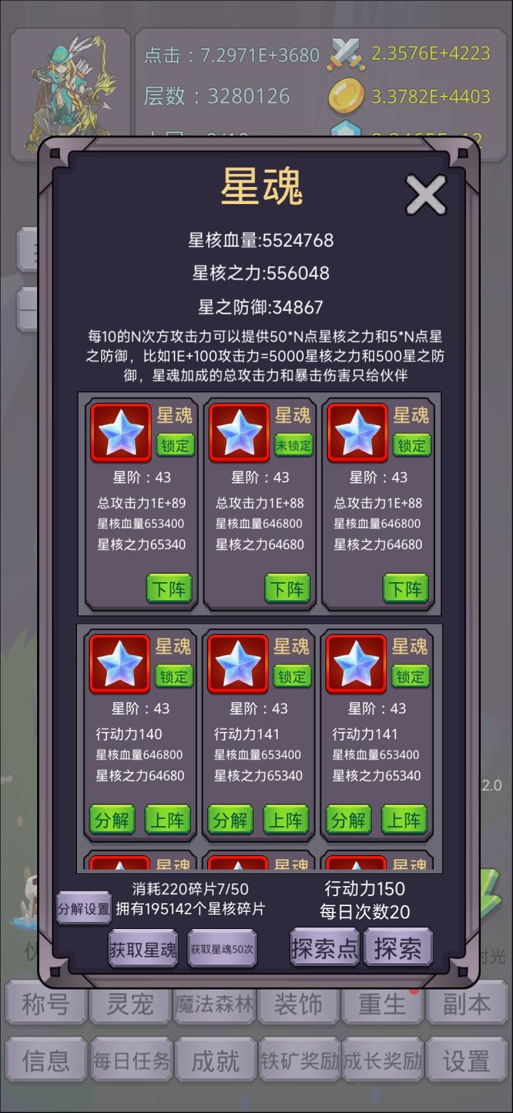副本篇游戏共有6个副本,分别是时空回廊(时空),巨人之塔(巨人),魔王位面(魔王),魔法森林(森林),贪婪深渊(贪婪)和星魂。我们由易到难依次进行介绍。1、巨人之塔①副本玩法巨人之塔就是点击挑战,自动攻击,每次获得巨人碎片和光环碎片。有碎片就升级根本不会输。说白了就是每天领取的福利,不需要动脑子。巨人之塔也有层数,层数越高奖励越多。可以选择层数,通过最高层自动开启下一层。如果打不过去了就选