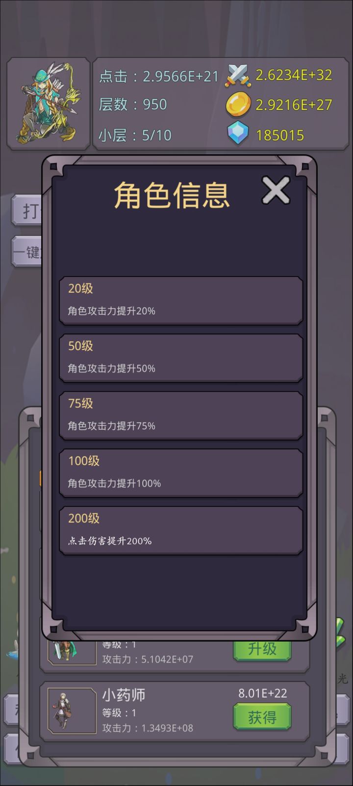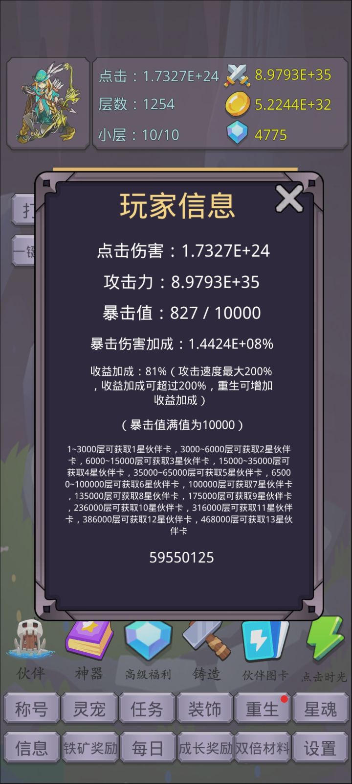 这游戏模块有很多,伙伴,神器,铸造,图卡,称号,灵宠,重生,星魂,信息首先解释一下,这游戏有点击伤害,攻击力和暴击伤害的输出来源,其中点击伤害是指手指点击造成的伤害,攻击力是固定一定时间间隔,攻击力面板造成的伤害,暴击伤害是指攻击时造成暴击的时候,最后造成的伤害乘以暴击伤害(指数很高)伙伴模块伙伴第一个是增加的点击伤害,后面的伙伴增加的都是攻击力,一般玩家会以为,直接购买最后一个伙伴升级就行