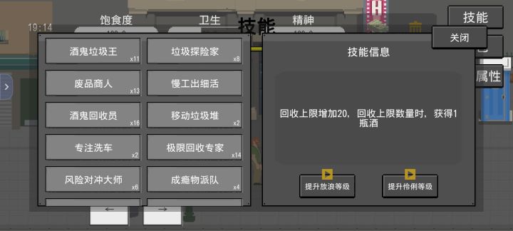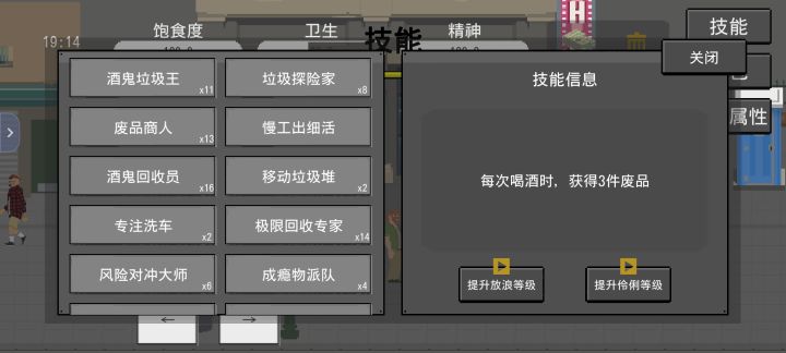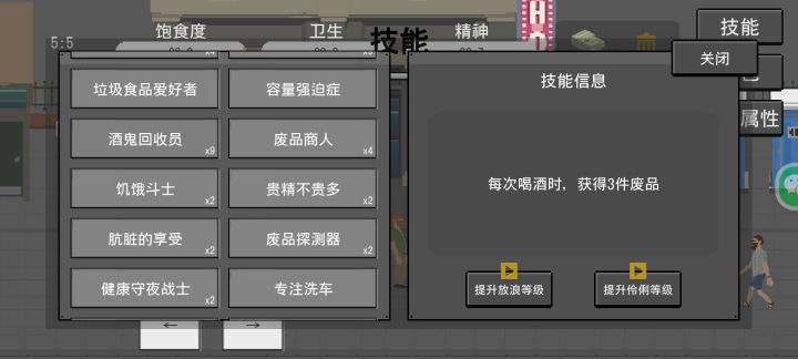 前期有啥吃啥,捡垃圾勉强度日。把这两个技能刷起来之后就能住废品回收站门口了。就看一个流浪汉,对着酒瓶子狂炫,一瓶酒变了十几二十个瓶子,用瓶子换钱再换新酒,无限循环。