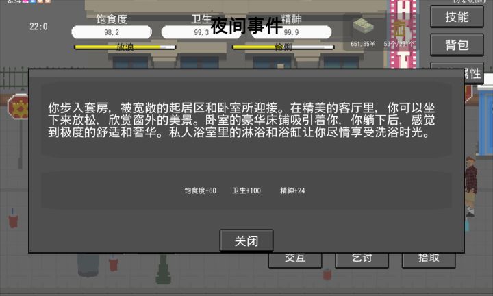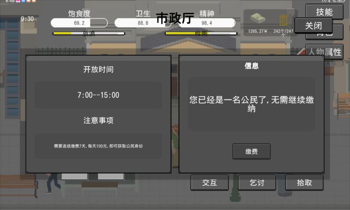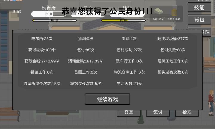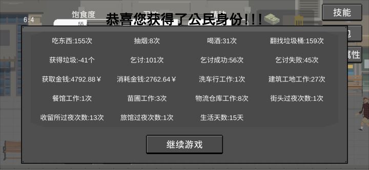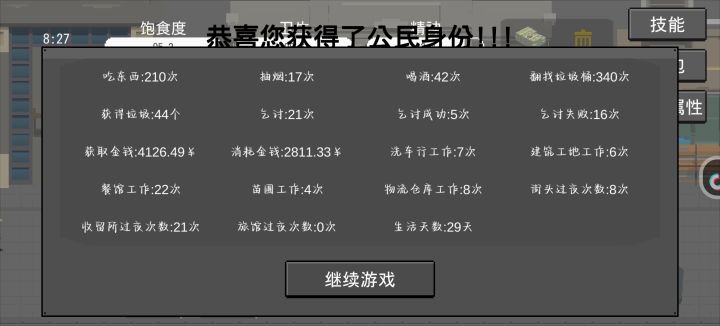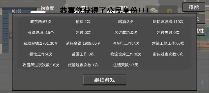 差不多这个样子,前期是挺难生存的,我看了挺多广告复活,后面就随意了,捡垃圾最赚钱,把技能都点捡垃圾上面,前期该吃吃该喝喝,不要有了100就去换掉弄公民身份!!!等有了800再去也不迟!!