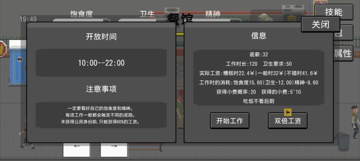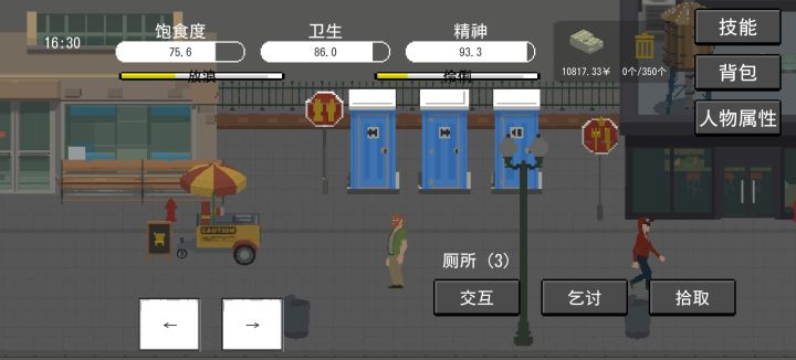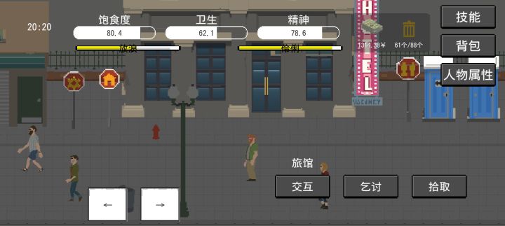 前期会比较忙,后期很闲,希望官方可以优化一下。可以稍微记一下地图,中间有很多收容所商店和小摊,两边有工地东和西,旅馆跟高级饭店只存在于两边,所以前期的话在四点左右尽量在中间几站待着,方便找收容所。精神主要是乞讨被骂扣的,如果精神很少就尽量不要乞讨,卫生可以在晚上的收容所还有白天厕所补充,有的工作对卫生有条件 ,可以注意一下,前期的话可以多买一点,便宜又大碗的汉堡或者热狗,或者去路边的饭店吃一个1