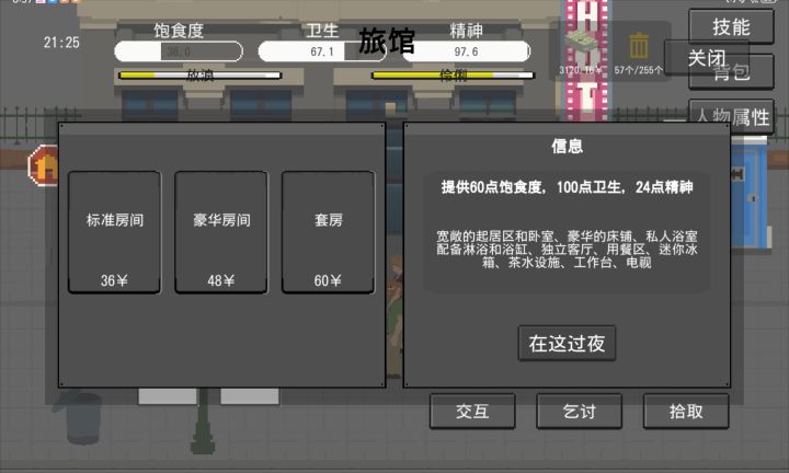 前期尽量都买烟买酒获得精神值,遇到垃圾就捡垃圾翻垃圾桶,钱不够再乞求去工地打工最赚钱,打工前看精神值如果消耗过高可以先喝酒抽烟就会降低给的机会大多选:废品值上升.速度.垃圾桶食物.过夜给予值上升.废品达到上限增值还有喝酒获得废品。收留过夜选择给消耗品或者饱腹值的
