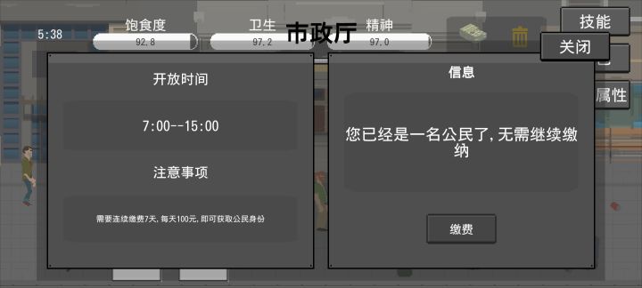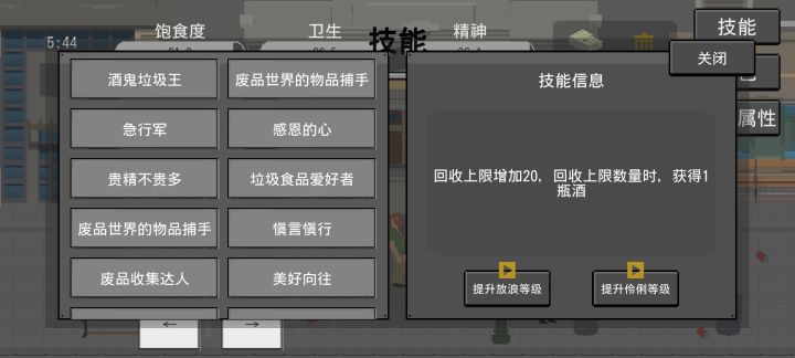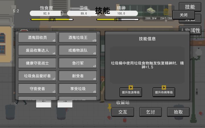 1.技能主要……增加价格,增加垃圾桶出食物概率,增加垃圾桶食物饱食度,增加跑路速度,增加垃圾数量,增加垃圾概率。2.垃圾捡满了在卖3.不需要看病,得病不死人4.前期要买点食物,免得饿死,后期靠垃圾桶食物果腹5.饿不死,生病不死,卫生0不死,精神0要死,睡觉就行了。6.前期可以打工,但是没必要,捡垃圾也饿不死。