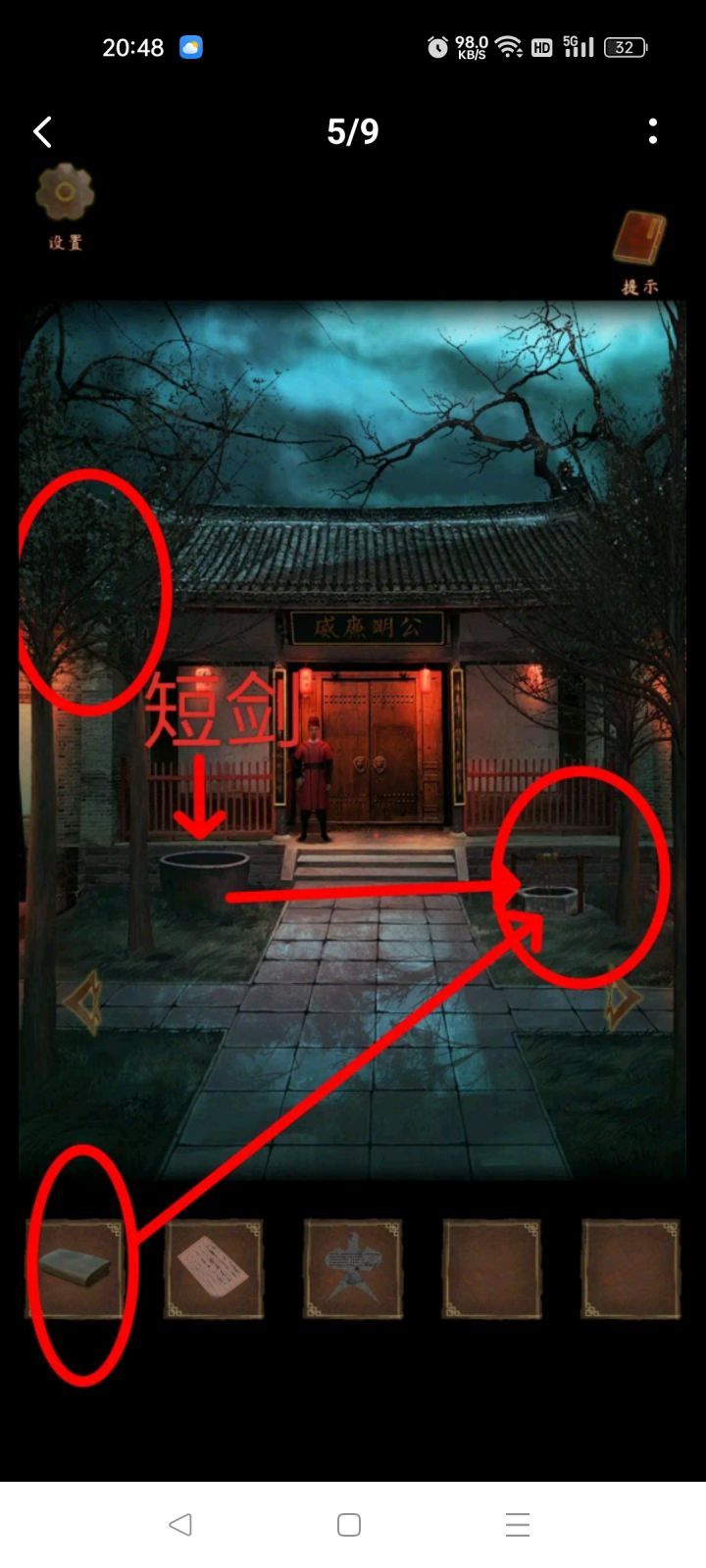 第三章:堕九幽1.(望乡台)点击雕像石碑,调整雕像的头到对应的身子2.暗格打开,获得【玉瓶】3.(供养阁)点击柜台,把【玉瓶】放入盆中,获得【阴兽之眼】(此步骤依据《阴阳易》)4.(望乡台)点击算卦台,把【阴兽之眼】放入碗中,点击签筒算卦,获得【下下签】5.点击右边树上的牌子,根据牌子的形状,结合【下下签】上的线索(正方形-解、圆形-思、五边形-狱、六边形-极),调整对应的字6.在树枝