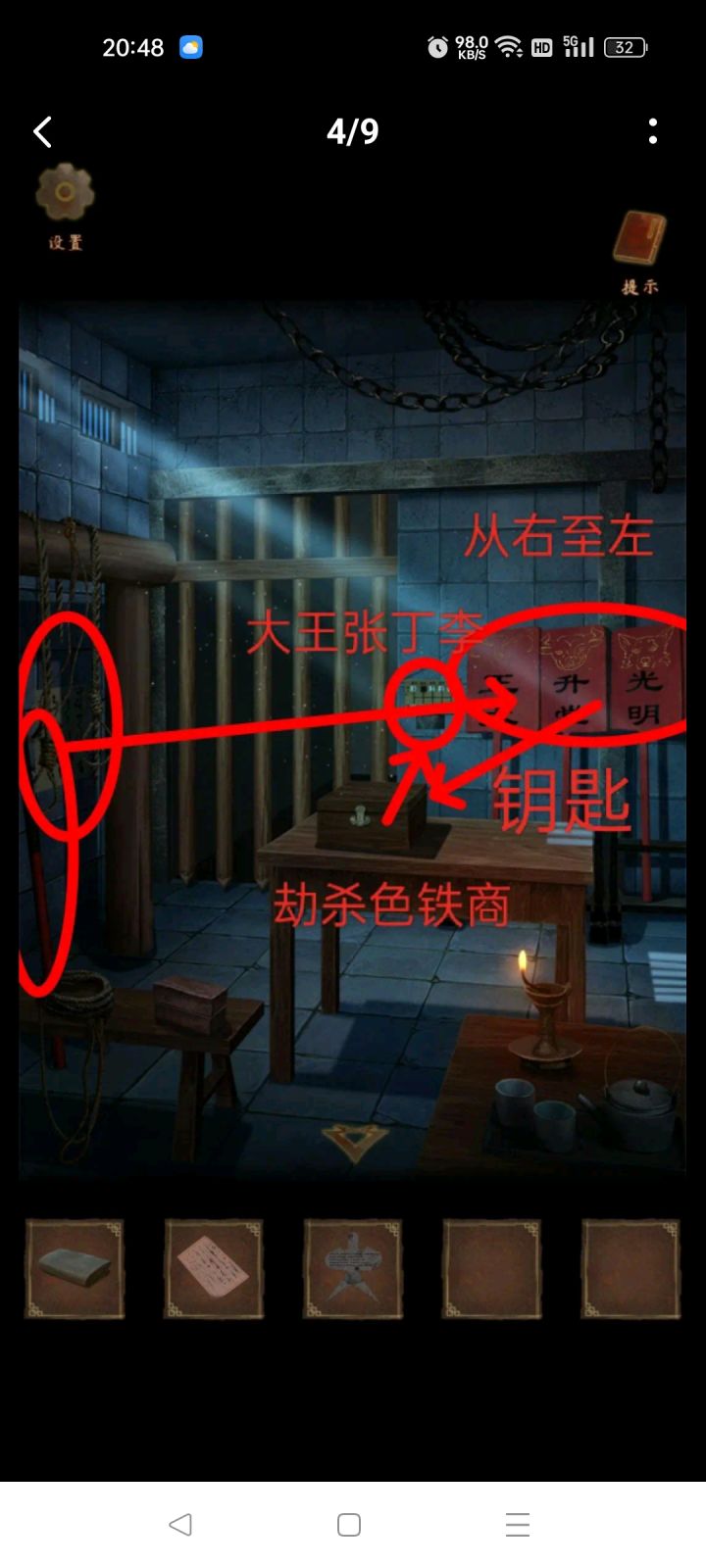 第二章:忆旧游1.(牢房)点击火盆,用火烧掉绳子2.点击桌子,查看信件3.点击获取角落里的【一桶水】4.点击兽首,获得【兽牙】5.点击写有狱字的布,用【兽牙】割开,获得【火钳】6.点击火盆,用【火钳】夹炭火7.点击柴火堆,倒上【一桶水】,用【炭火】点燃8.(监狱走廊)点击右边的牢房,和公孙刽对话,获得【火折子】9.(证物房)点击桌子,查看信件10.点击烛台,用【火折子】点燃蜡烛