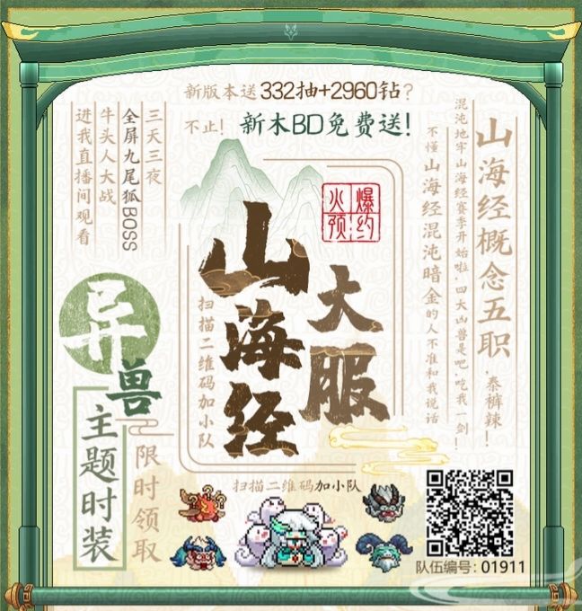 山海经大服解冻中,加入我的山海经小队,领取限时异兽时装和四凶兽组队头套,做新年最靓的仔!https://wdyz.r2games.com.cn/act/reserve/?inviteToken=LNMtxIiFpPD4