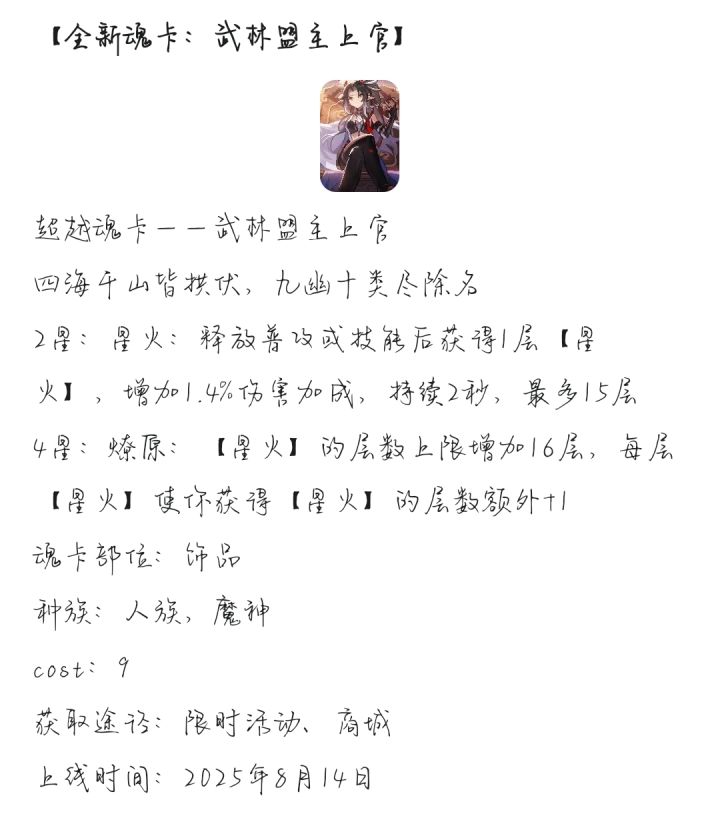 新魂卡上官的出现,可以在一定程度上缓解牧师当前缺少全伤的压力。该魂卡初步预估是可以让忍者以及牧师得到一个较为不错的提升。该魂卡为叠层类魂卡二星:每层可每层可以获得1.4%的全伤,上限15层四星:提高16层上限【15+16】共计31层,提高叠层速度魂卡位置为:饰品卡替换魂卡为伟大前程属性替换:30技伤换43.4全伤牧师,忍者:无脑做即可游侠,战士:是不太推荐制做,因为在当前体系如果用