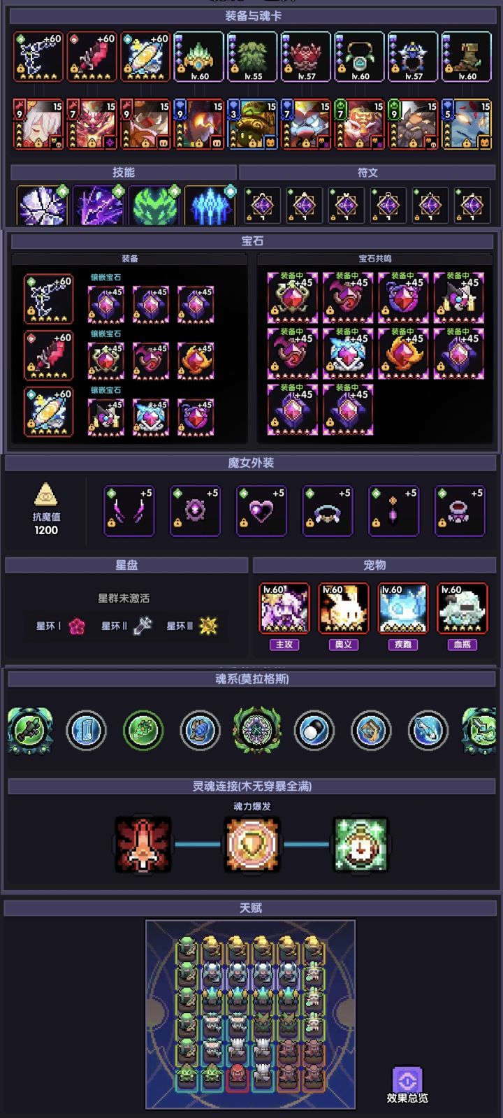 前言:话不多说,最后冲刺!PS后的内容多比较重要!【目录】一、【一图流】二、【关卡介绍】三、【暗金】四、【武器】五、【魂卡】六、【天赋】七、【符文】八、【魂树】九、【魂系】十、【技能】十一、【宠物】十二、【魔女外装】十三、【星盘】十四、【小屋buff】十五、【炼金buff】十六、【宝石】十七、【打法参考】一、【一图流】二、【关卡介绍】护甲:9380,元素抗