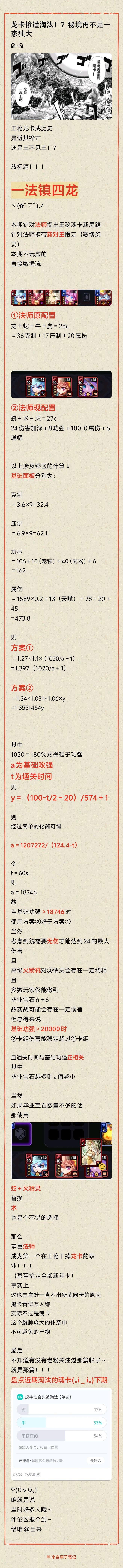 省流:a为基础攻强t为通关时间则y=(100-t/2-20)/538+1经过简单的化简可得a=1207272/(124.4-t)当基础功强>18746时使用方案②好于方案①最后不知道有没有老粉关注过那篇帖子~就是那篇!!!盘点近期淘汰的魂卡(。ì _ í。)下期♡(ӦvӦ。)咱就是说当时好多人哦~评论区报个到~给咱@出来#我的勇者 #我的勇者新限定 #我的勇者魂